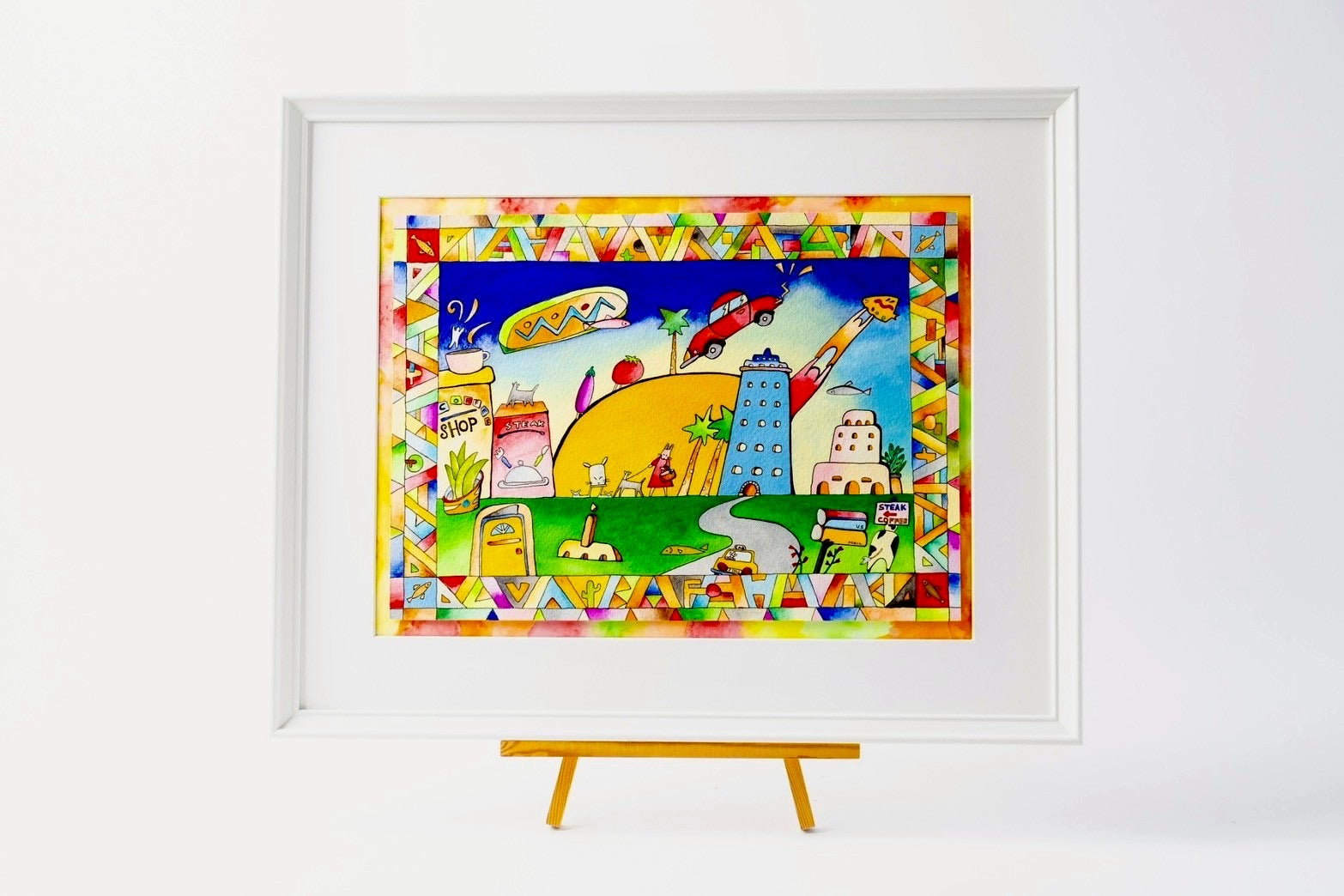 空には車が飛び、カフェやお店がやさしい光に囲まれて並んでいます。