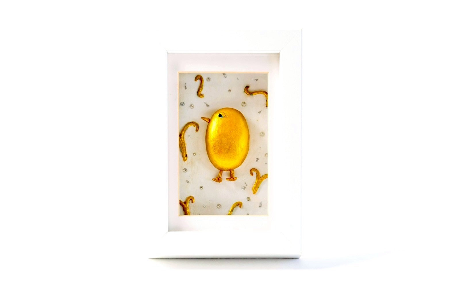 「金の卵」—あなたの中にある力を育てるアート。卵のような形に、金色にきらめく小さなひよこ。銀石や金粉、純金や銀箔などを使って、内側から輝くようなエネルギーを込めました。